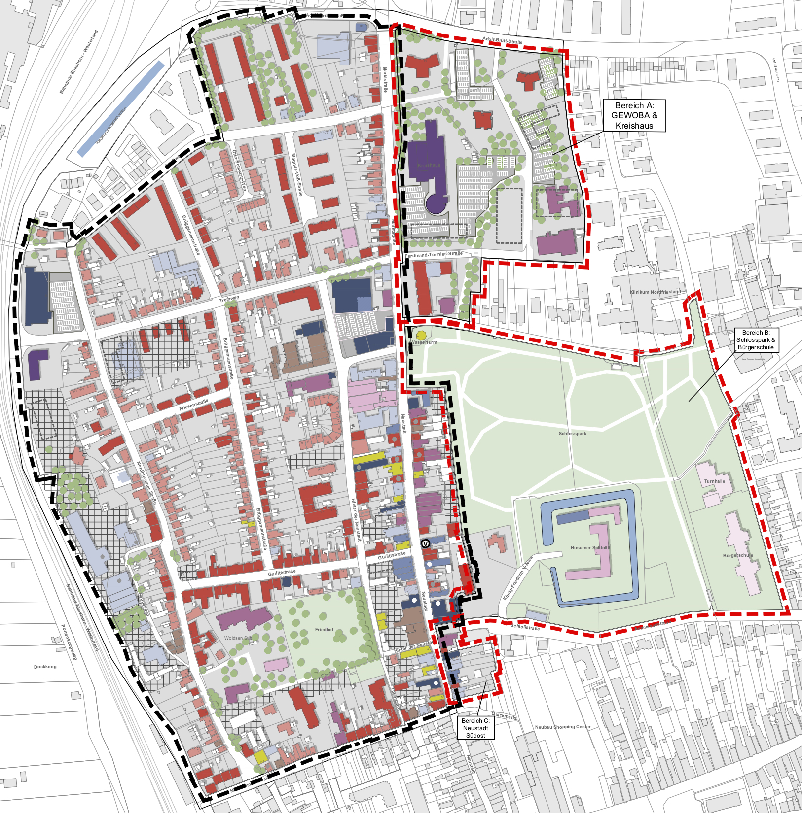 Die Obere Neustadt ist ein gemischtes Quartier nahe der Husumer Innenstadt, das durch Wohnen, Einkaufen und Kultur sowie eine große Anzahl sozialer Einrichtungen geprägt ist. Insbesondere der Straßenzug Neustadt/ Markt ist von Leerständen und teilweisen Fehlnutzungen geprägt. Mangelnde Barrierefreiheit und teilweise sanierungsbedürftige Gebäude sowie wenig Grün- und Freiflächen kommen dazu. Gleichzeitig entstehen neue, auch anspruchsvolle Wohn- und Geschäftsgebäude – u.a. wird das Kreistagshaus neu gebaut.